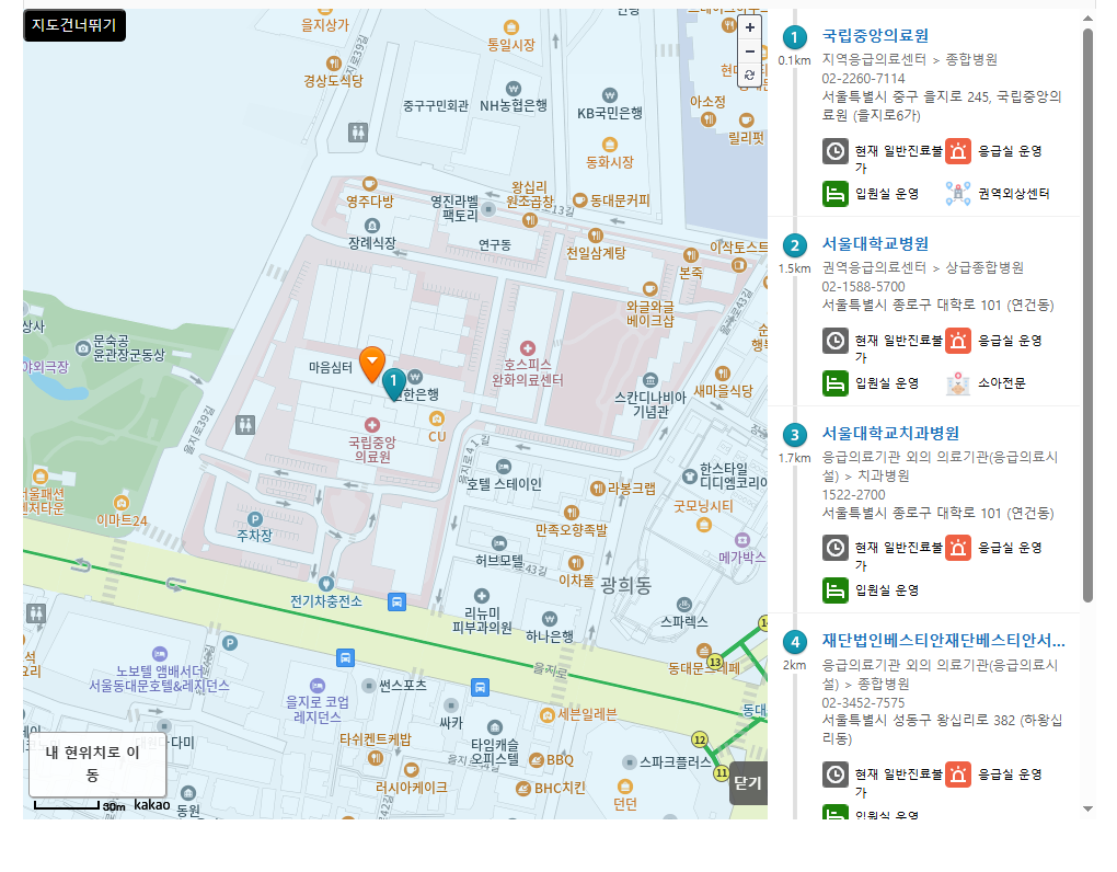 - 운영 시간도 함께 표시되어 있어서 심야에도 근처 24시 약국을 찾기 편리해요!