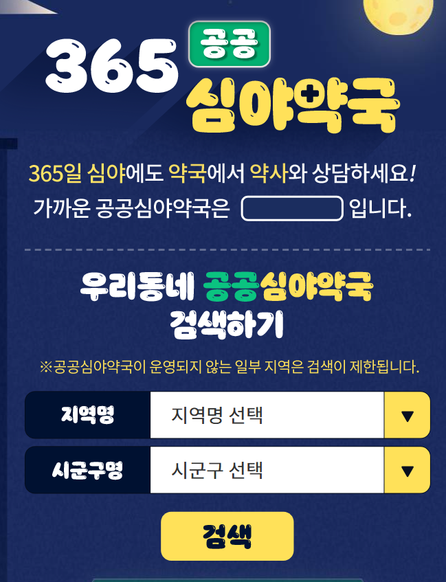 - 밤늦은 시간에도 문을 여는 공공심야약국 리스트를 검색할 수 있어요.