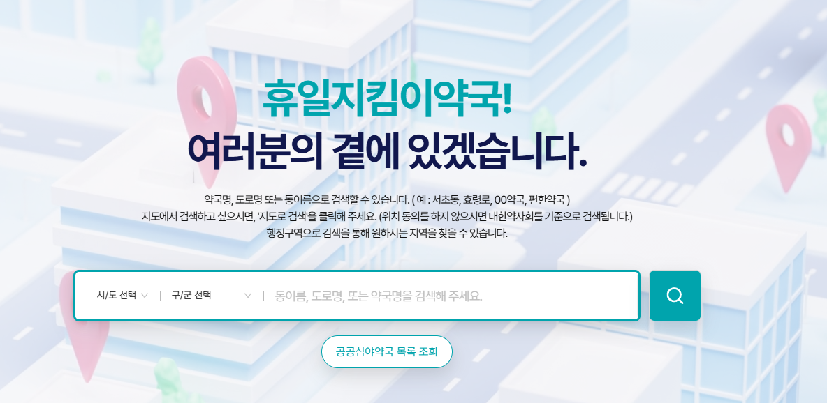 - 지역 또는 현재 위치를 입력하면 가장 가까운 근처 약국 정보가 나와요.